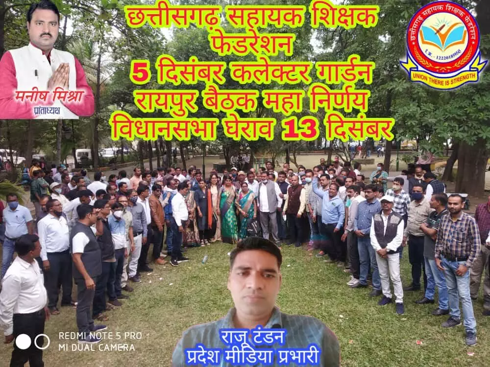 रायपुर 6 दिसम्बर 2021 छत्तीसगढ़ सहायक शिक्षक फेडरेशन का प्रदेश अध्यक्ष मनीष मिश्रा ने बताया की विगत 4 सितंबर को मुख्यमंत्री भूपेश बघेल जी द्वारा हमारे प्रतिनिधिमंडल को आश्वासन दिया गया था कि 90 दिनों की कमेटी बनाई जाएगी उसके बाद 3 महीने के बाद आप लोगों की जो रिपोर्ट आएगी उसके आधार पर वेतन विसंगति दूर कर दी जाएगी विदित हो कि कांग्रेश की शासन को 3 साल हो गए और कांग्रेस के घोषणा पत्र में भी सहायक शिक्षकों की वेतन विसंगति दूर करने की मांग शामिल है हमारी सरकार आएगी तो वेतन विसंगति दूर करेंगे कहा गया था माननीय टीएस बाबा कैबिनेट मंत्री महोदय द्वारा भी वीडियो के माध्यम से बताया गया है कि सहायक शिक्षकों के वेतन विसंगति है वर्ग 1 और 2 के वेतन में बहुत कम अंतर है और वर्ग 3 के अंतर में बहुत ज्यादा अंतर है जिसको वित्तीय मामला है और इसको पूरा किया जाएगा तो कब तक पूरा किया जाएगा कब तक सहायक शिक्षक जो है सब्र करेंगे समस्त 109000 सहायक शिक्षक आक्रोशित है की सीएम साहब की घोषणा का पालन नहीं हुआ अधिकारी अपने कामों में व्यस्त हैं प्रमुख सचिव शिक्षा की अध्यक्षता में अंतर विभागीय कमेटी बनाई गई थी लेकिन आज 3 महीने हो जाने के बावजूद रिपोर्ट सरकार को नहीं सौंपी गई है और जिसके कारण से आज 5 दिसंबर 2021 को कलेक्टर गार्डन रायपुर में छत्तीसगढ़ सहायक शिक्षक फेडरेशन के प्रदेश अध्यक्ष मनीष मिश्रा की उपस्थिति में समस्त छत्तीसगढ़ के प्रांतीय कार्यकारिणी जिला कार्यकारिणी एवं ब्लाक अध्यक्ष पूरे 109000 सहायक शिक्षकों के प्रतिनिधि उपस्थित थे और विचार मंथन करके एक निर्णय लिया गया जिसमें 11 दिसंबर से अनिश्चितकालीन हड़ताल किया जाएगा और 13 दिसंबर को विधानसभा का घेराव किया जाएगा यह घोषणा मनीष मिश्रा प्रदेश अध्यक्ष द्वारा किया गया सरकार के अधिकारियों के इस प्रकार के रवैया से पूरे छत्तीसगढ़ की शिक्षा व्यवस्था में ताला लग जाएगी जिसकी प्रवाह अधिकारी नहीं कर पा रहे हैं विदित हो कि छत्तीसगढ़ सहायक शिक्षक छत्तीसगढ़ की सबसे बड़ी संगठन है जिसमें 109000 सहायक शिक्षक सदस्य हैं उपरोक्त बैठक में मनीष मिश्रा सुखनंदन यादव अजय गुप्ता सी.डी. भट्ट सिराज बक्स बलराम यादव बसंत कौशिक कौशल अवस्थी अश्वनी कुर्रे चंद्र प्रकाश तिवारी श्रीमती प्रेमलता शर्मा राजकुमार यादव श्रीमती रीता भगत संजय यादव शशि कला उरांव विश्व कांत शर्मा ढोला लाल पटेल प्रेम नारायण शर्मा देवेंद्र हरमुख शंकर साहू ईश्वर चंद्राकर अशोक नाथ उत्तम बघेल देवराज खुटे टिकेश्वर बॉय शेषनाग पांडे सत्रोहन सिंह महिलांगे राजेंद्र अति भोपालपटनम कृष्णा वर्मा धनंजय वर्मा पुलिस चंद्राकर मनीष डड़सेना ओम प्रकाश वर्मा बुधनी अजय राजाराम पटेल मनोज कुवाकोंडा सरणदास बसना सुरजीत सिंह चौहान कायम अली 