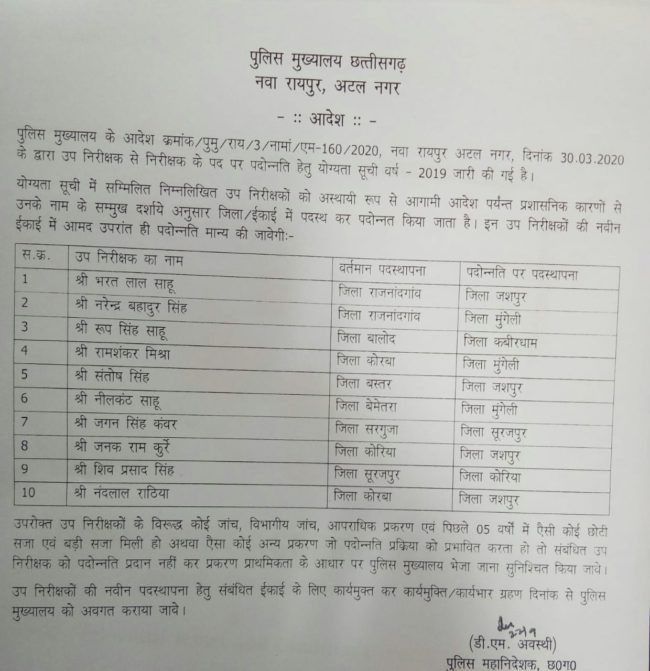रायपुर 22 अगस्त 2021। डीजीपी डीएम अवस्थी द्वारा विभिन्न इकाईयों में पदस्थ 10 सब इंस्पेक्टर को इंस्पेक्टर के पद पर पदोन्नति एवं नवीन पदस्थापना आदेश जारी किये गये हैं। जारी पदोन्नति आदेश के अनुसार नवीन इकाई में आमद उपरांत ही पदोन्नति मान्य की जाएगी।