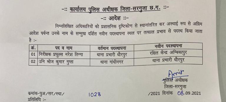 अंबिकापुर 8 सितम्बर 2021. सरगुजा में पदस्थ 2 इंस्पेक्टरों को इधर से उधर किया गया है. देखें लिस्ट