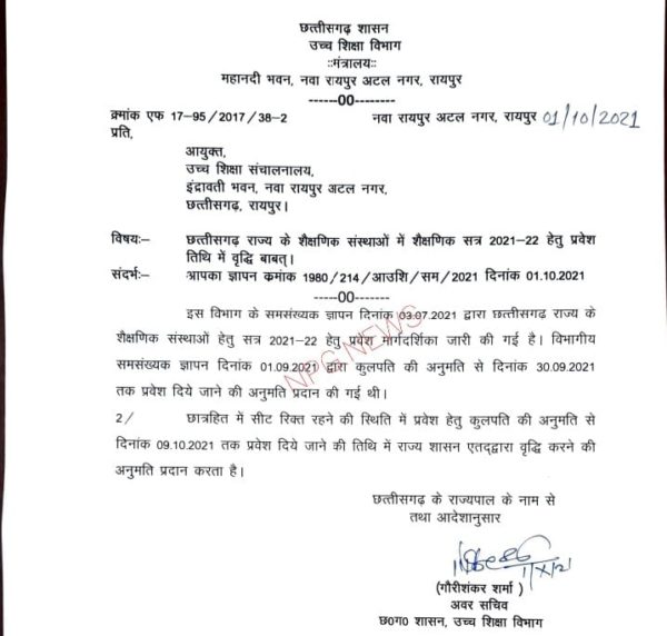 रायपुर, 1 अक्टूबर 2021। कॉलेजों में दाखिले की अंतिम तारीख बढ़ा दी गई है। इस संबंध में मंत्रालय के अवर सचिव ने उच्च शिक्षा आयुक्त को लेटर भेज दिया है।