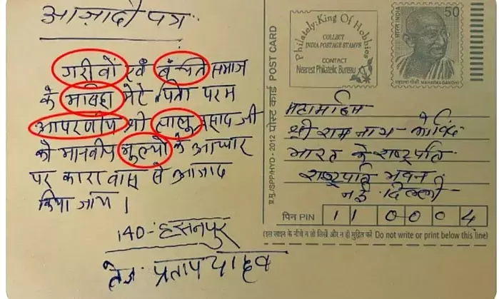 पटना 26 जनवरी 2021।. बिहार के पूर्व स्वास्थ्य मंत्री और राजद सुप्रीमो लालू प्रसाद के पुत्र तेज प्रताप यादव ने अपने पिता की सजा माफी के लिए सरकार से गुहार लगायी है. तेज प्रताप ने एक पोस्टकार्ड पर चंद लाइन लिखकर राष्ट्रपति से लालू यादव की सजा माफ करने की मांग की है. दिल्ली एम्स में इलाजरत लालू प्रसाद की हालत चिंताजनक बतायी जा रही है. इसी को देखते हुए उनकी रिहाई की मांग की गयी है.