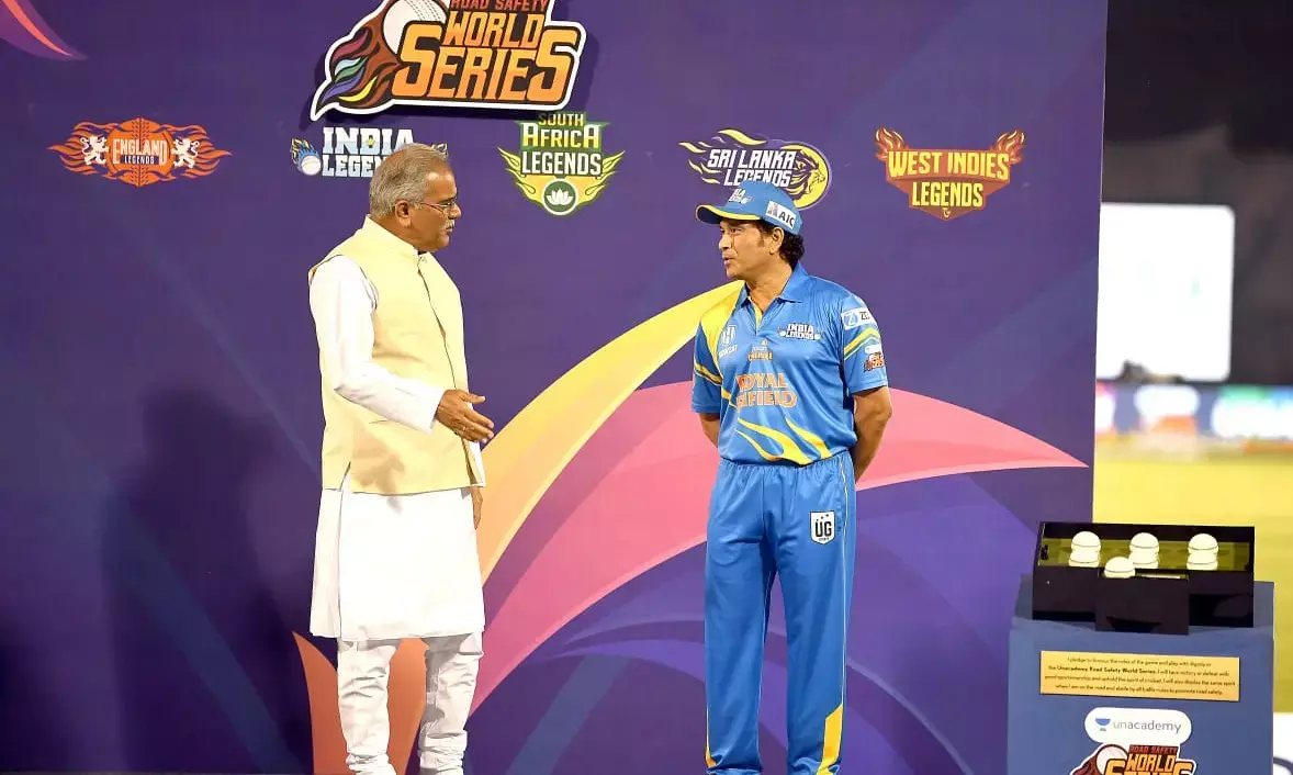 रायपुर, 05 मार्च 2021. मुख्यमंत्री भूपेश बघेल द्वारा आज छत्तीसगढ़ की राजधानी रायपुर के शहीद वीर नारायण सिंह अंतरराष्ट्रीय क्रिकेट स्टेडियम में किए गए शुभारंभ के साथ ही रोड सेफ्टी क्रिकेट टी-20 वर्ल्ड सीरीज की शुरुआत हो गई। सीरीज का शुभारंभ शानदार आतिशबाजी के साथ हुआ। मुख्यमंत्री भूपेश बघेल ने रोड सेफ्टी संकल्प पर हस्ताक्षर किए और रोड सेफ्टी वर्ल्ड क्रिकेट सीरीज के शुभारंभ की घोषणा की। पहला मैच इंडिया लीजेंड्स और बांग्लादेश लीजेंड्स के बीच हुआ। क्रिकेट मैच का शुभारंभ बांग्लादेश और भारत के राष्ट्र-गान के साथ हुआ। इस क्रिकेट-श्रृंखला के उद्घाटन अवसर पर मुख्यमंत्री बघेल ने छत्तीसगढ़ की 02 करोड़ 80 लाख जनता की ओर से इस वर्ल्ड सीरीज में शामिल हो रहे सभी खिलाड़ियों का स्वागत किया। उन्होंने कहा कि क्रिकेट के भगवान कहे जाने वाले सचिन तेंदुलकर यहां पहुंचे हैं। साथ ही युवराज सिंह, मोहम्मद कैफ, मुनाफ पटेल, वीरेंद्र सहवाग समेत भारतीय और बांग्लादेश के सभी क्रिकेट सितारे यहां पहुंचे हैं।