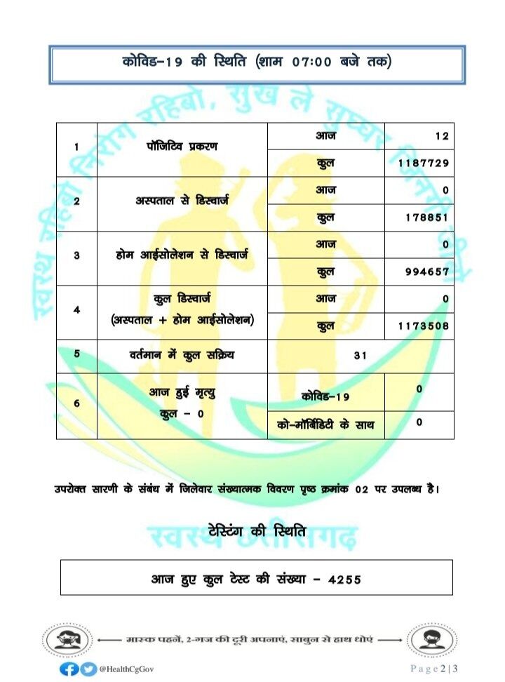 इनमें दुर्ग में 6, राजनांदगांव 1, रायपुर 1, रायगढ़ 2, जांजगीर-चांपा 1, बस्तर में 1 मिले। 4255 लोगों का टेस्ट भी गुरुवार को किया गया। प्रदेश की औसत पॉजिटिव दर 0.28 प्रतिशत है।
