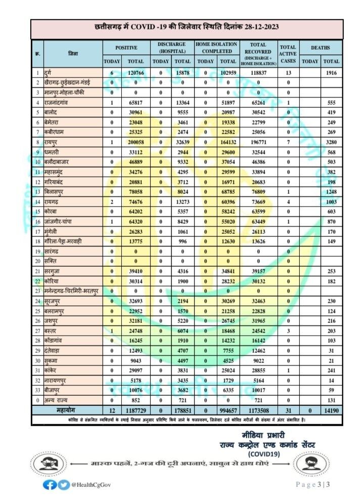 CG कोरोना ब्रेकिंग: छत्तीसगढ़ में कोरोना से एक की मौत, एक्टिव मरीजों की संख्या पहुंची 31
