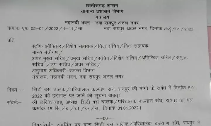रायपुर, 5 जनवरी 2022। राजधानी में सिटी बसें 5 जनवरी (आज) को बंद रहेंगी। सामान्य प्रशासन विभाग ने मंत्रालय और विभागाध्यक्ष याने इंद्रावती भवन के विभाग प्रमुखों से कहा है कि 5 जनवरी को अधिकारी, कर्मचारी नवा रायपुर आने के लिए अपनी खुद की व्यवस्था करें। देखिए, जीएडी का लेटर-