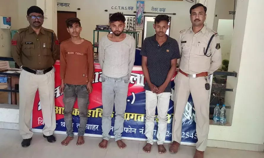 आरोपियो की गिरफ्तारी हेतु तारबहार थाने के उप निरीक्षक मिलन सिंह,प्रधान आरक्षक सूरज तिवारी व आरक्षक दीपक उपाध्याय की टीम बना कर भेजी गई। पुलिस टीम बाई रोड तड़के सुबह साढ़े पांच बजे सागर से 15 किलोमीटर दूर बहरिया थाना क्षेत्र स्थिति आरोपियो के पते पर पहुँच गयी। एक आरोपी आश्चर्यजनक ढंग से घर की सीढ़ी के नीचे छुप कर सोया हुआ था,जिसे पुलिस ने अपने गिरफ्त में लिया। उसके बाद दरवाजा खटखटा कर घर के अंदर से दो आरोपियो को पकड़ा। सिविल ड्रेस में पुलिस को देख कर आरोपी व उनकी माँ हंगामा मचाने लगे जिस पर पुलिस कर्मियों द्वारा अपना आईडी कार्ड दिखाया गया। पर आरोपी और उनके घर वाले पहले लोकल पुलिस को लेकर आने उसके बाद ही कार्यवाही करने को अड़े रहे। इस बीच आरोपियो की मॉ ने पुलिस कर्मियों पर डंडे से हमला करते हुए प्रधान आरक्षक को चार पाँच डंडे जमा दिए। बीच बचाव में आये उपनिरीक्षक मिलन सिंह को भी दो तीन डंडे पड़े। पुलिसकर्मियों की सूचना पर लोकल बहरिया थाने की भी पेट्रोलिंग टीम पहुँच गयी। और स्थिति को नियंत्रण में लेकर तीनो आरोपियो की गिरफ्तारी कर बहरिया थाने लाया गया।जहां से पूछताछ व प्रक्रिया कर बिलासपुर आरोपियो को लाया गया।