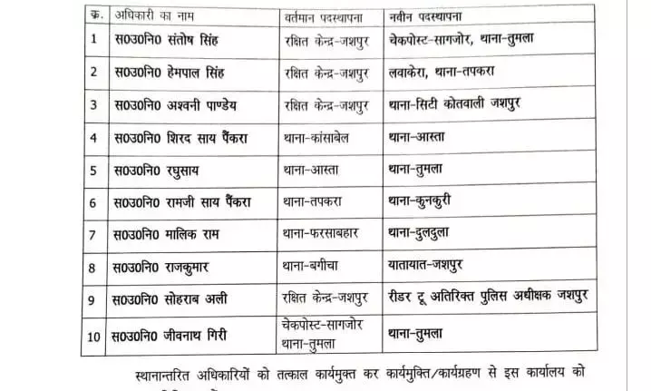 जशपुर 26 अक्टूबर 2021। एसपी विजय अग्रवाल ने जिले में पदस्थ 10 एएसआई को इधर से उधर किया है। जारी सूची में जिल पुलिसकर्मियों के नाम हैं, वो इस प्रकार है...