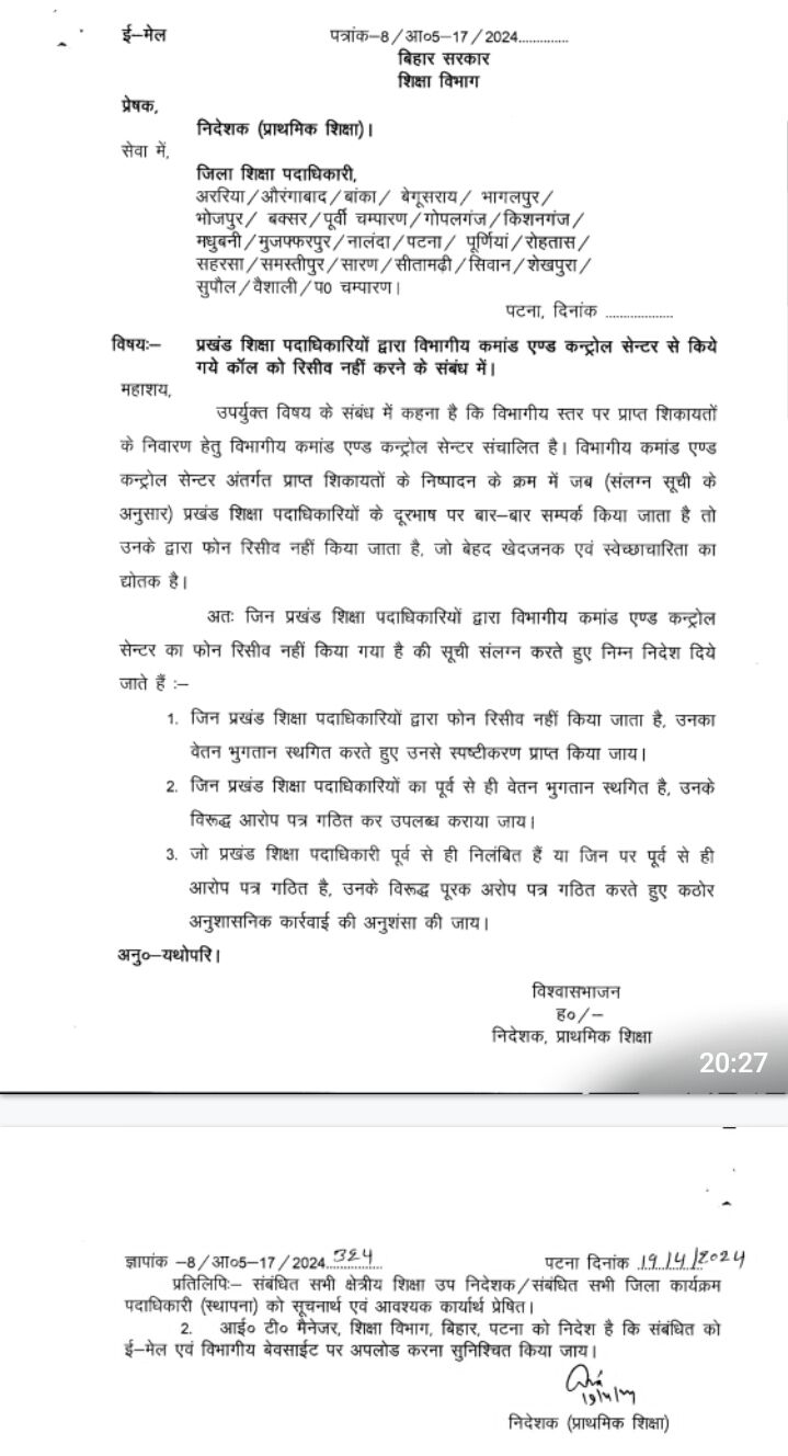 इस मामले में जब शिक्षा विभाग ने जांच की तो 25 जिलों के 67 प्रखंड शिक्षा पदाधिकारी पाए पाए गए जो कॉल का जवाब नहीं देते हैं. जिसके बाद शिक्षा विभाग ने कड़ी कार्रवाई करते हुए बीईओ वेतन भुगतान बंद करने का आदेश जारी किया है. साथ ही मामले में स्पष्टीकरण माँगा है. आदेश में कहा गया है कि जिन प्रखंड शिक्षा पदाधिकारीयों का पूर्व से ही वेतन भुगतान स्थगित है उनके विरुद्ध आरोप पत्र गठित करके उपलब्ध कराया जाए. जो प्रखंड शिक्षा पदाधिकारी पूर्व से ही निलंबित हैं या जिन पर पूर्व से ही आरोप पत्र गठित है, उनके विरूद्ध पूरक अरोप पत्र गठित करते हुए कठोर अनुशासनिक कार्रवाई की अनुशंसा की जाए.