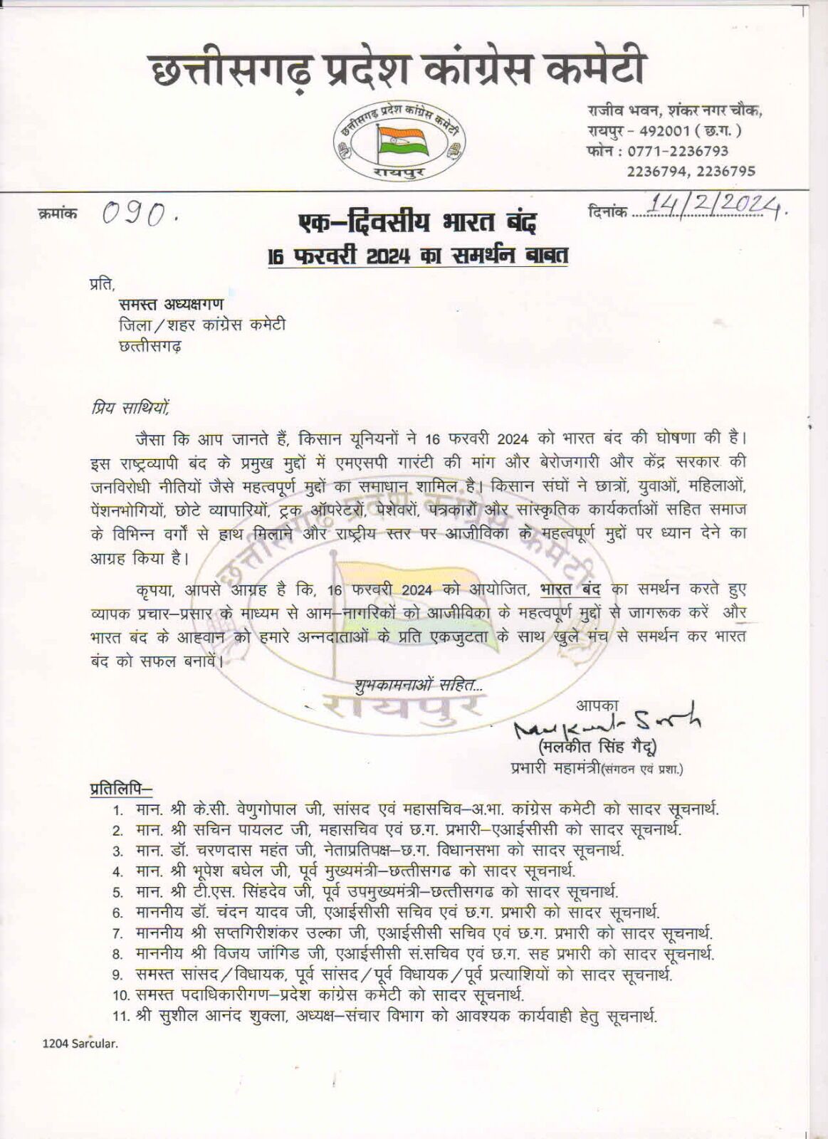 Bharat Bandh on 16th February: 16 को छत्तीगसढ़ बंद: किसानों के भारत बंद का प्रदेश कांग्रेस ने किया समर्थन, पीसीसी ने जारी किया पत्र...