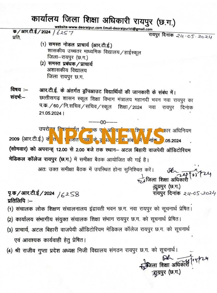 यह भी पढ़ें- CG प्राइवेट स्कूलों पर सरकार ने कसा शिकंजा: स्कूल शिक्षा सचिव ने RTE वाले बच्चों की मांगी ड्राप आउट रिपोर्ट, कलेक्टरों को 5 साल की समीक्षा करने के निर्देश...