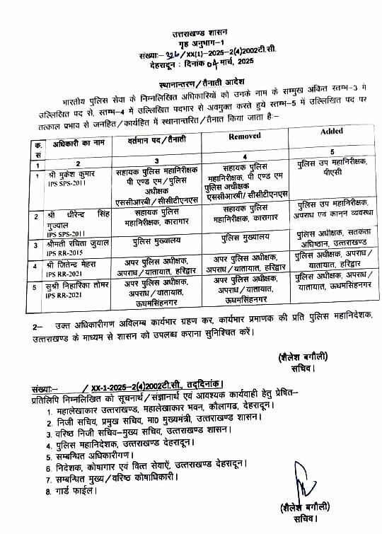 उत्तराखंड में 5 आईपीएस का ट्रांसफर (Uttarakhand IPS Transfer)