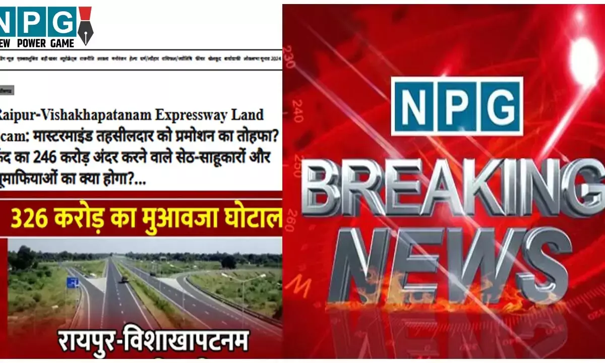 NPG की खबर पर 326 करो़ड़ के मुआवजा घोटाले में डिप्टी कलेक्टर को सरकार ने किया निलंबित... रायपुर-विशाखापट्टनम सिक्स लेन ग्रीन कारिडोर के मुआजवा घोटाले में सरकार ने डिप्टी कलेक्टर शशिकांत कुर्रे को सस्पेंड कर दिया।