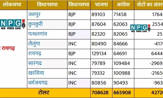 रायगढ़ संसदीय क्षेत्र में विधानसभा की कुल 8 सीटे हैं। प्रदेश के मुख्यमंत्री विष्णुदेव साय का गृह जिला और निर्वाचन क्षेत्र जशपुर भी इसी संसदीय क्षेत्र में आता है। साय इस सीट से लगातार 3 बार सांसद रहे हैं। 2023 के विधानसभा चुनाव में यहां की 8 में से 4 सीटों पर कांग्रेस और 4 पर बीजेपी ने जीत दर्ज किया था।