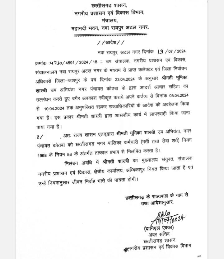 CG CMO suspended रायपुर। छत्तीसगढ़ सरकार ने अगल अलग मामलों में नगरीय प्रशासन एवं विकास विभाग के तीन अधिकारियों को निलंबित कर दिया है। इस बाबत आदेश भी जारी किया गया है। आदेश में दो उप अभियंता और एक सीएमओ शामिल है। नीचे देखें लिस्ट..