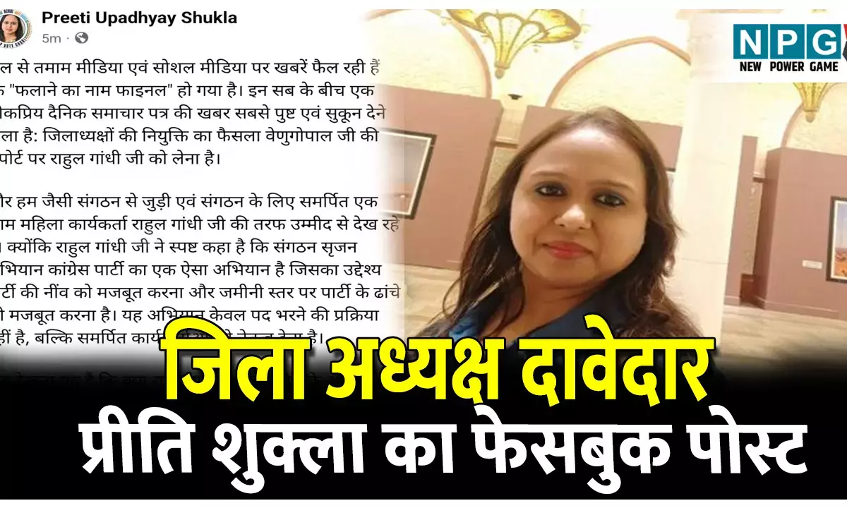 CG Congress: रायपुर। कांग्रेस में संगठन सृजन का दौर चल रहा है। शहर व जिला कांग्रेस कमेटी के अध्यक्षों की नियुक्ति होनी है। इसे लेकर अटकलबाजी भी चल रही है। मीडिया रिपोर्ट और अटकलों के बीच जिला कांग्रेस कमेटी अध्यक्ष की दावेदार प्रीति शुक्ला ने फेसबुक पर कुछ इस अंदाज में अपनी बात रखी है।