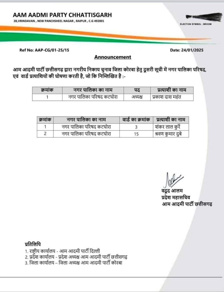 CG Mayor Election: आप पार्टी ने महापौर, नगर पालिका परिषद और वार्ड प्रत्याशियों का ऐलान किया है। नीचे देखें सूची...