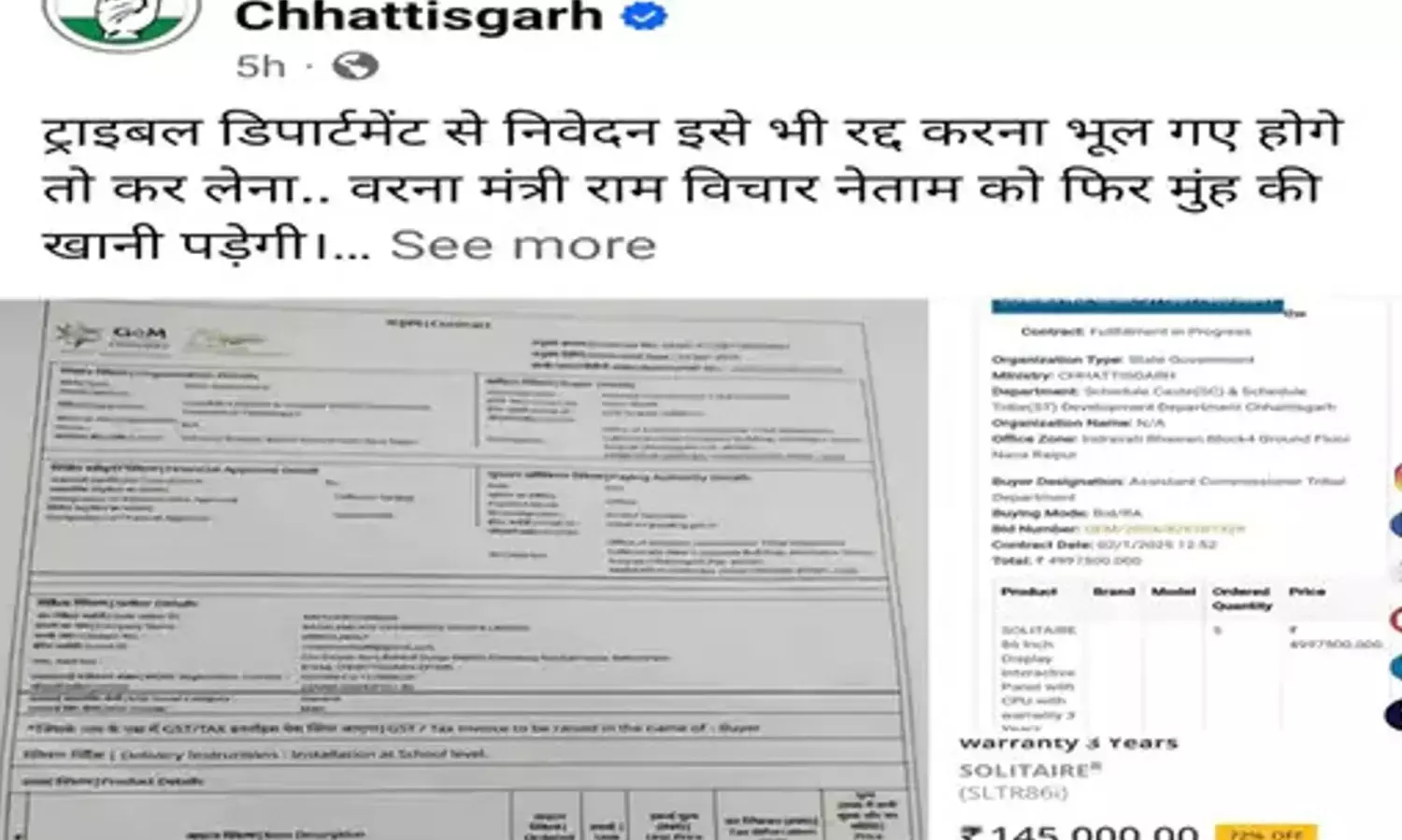 CG GeM Purchase Scam: छत्तीसगढ़ के आदिम जाति कल्याण विभाग में एक अकथित घोटाला उजागर हुआ है। विभाग ने 1.49 लाख रुपए की इंटरेक्टिव डिजिटल टीवी यूनिट को 10 लाख रुपए में खरीदा, और सिर्फ दो कमरों वाली फर्म से 5 यूनिट्स की डील कर दी, जिसके लिए सांसद निधि से ₹50 लाख का भुगतान भी कर दिया गया।