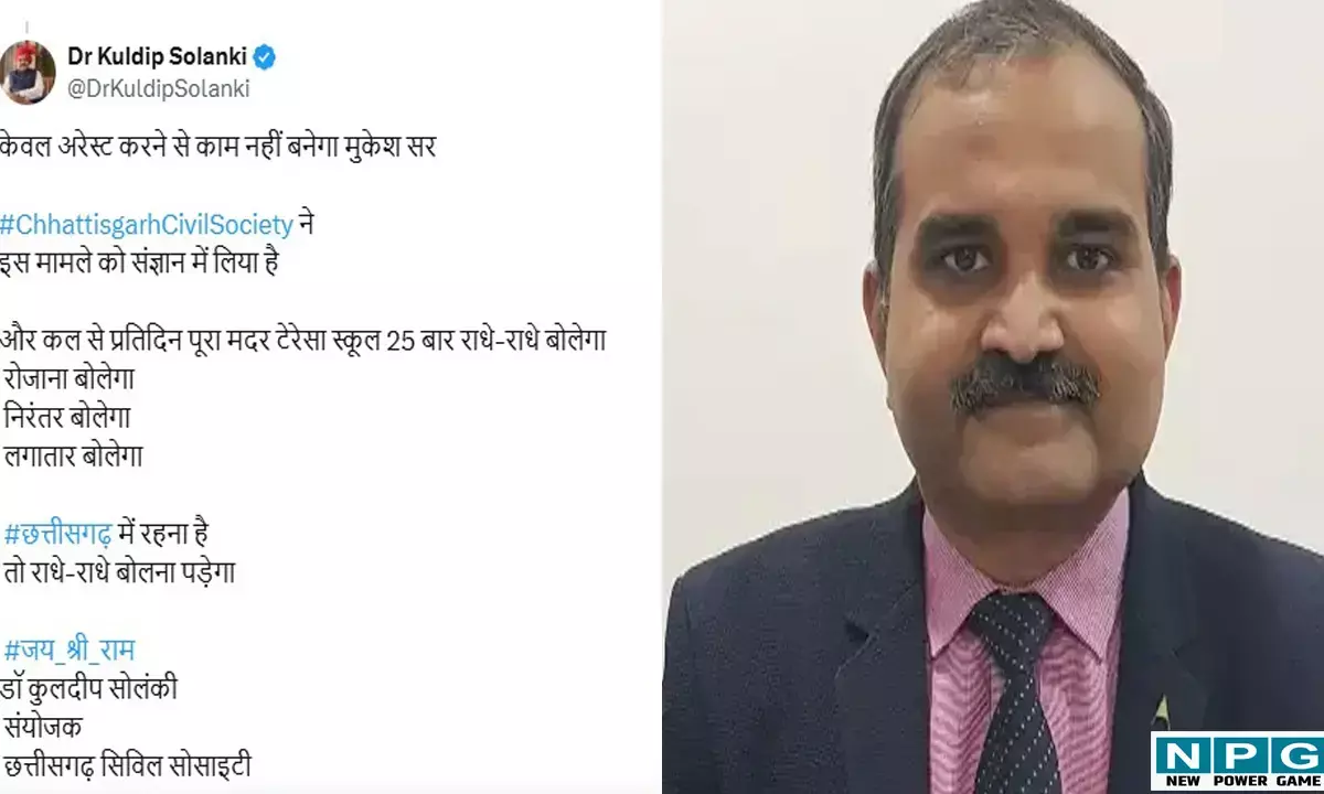 प्रदेश संयोजक डॉ. कुलदीप सोलंकी ने लिखा है कि केवल अरेस्ट करने से काम नहीं बनेगा। छत्तीसगढ़ सिविल सोसायटी ने इस मामले को संज्ञान में लिया है। वे आगे लिखते हैं कि कल से प्रतिदिन पूरा मदर टेरेसा स्कूल 25 बार राधे-राधे बोलेगा, रोजाना बोलेगा,निरंतर बोलेगा ,लगातार बोलेगा। फिर लिखते हैं छत्तीसगढ़ में रहना है तो राधे राधे बोलना पड़ेगा।