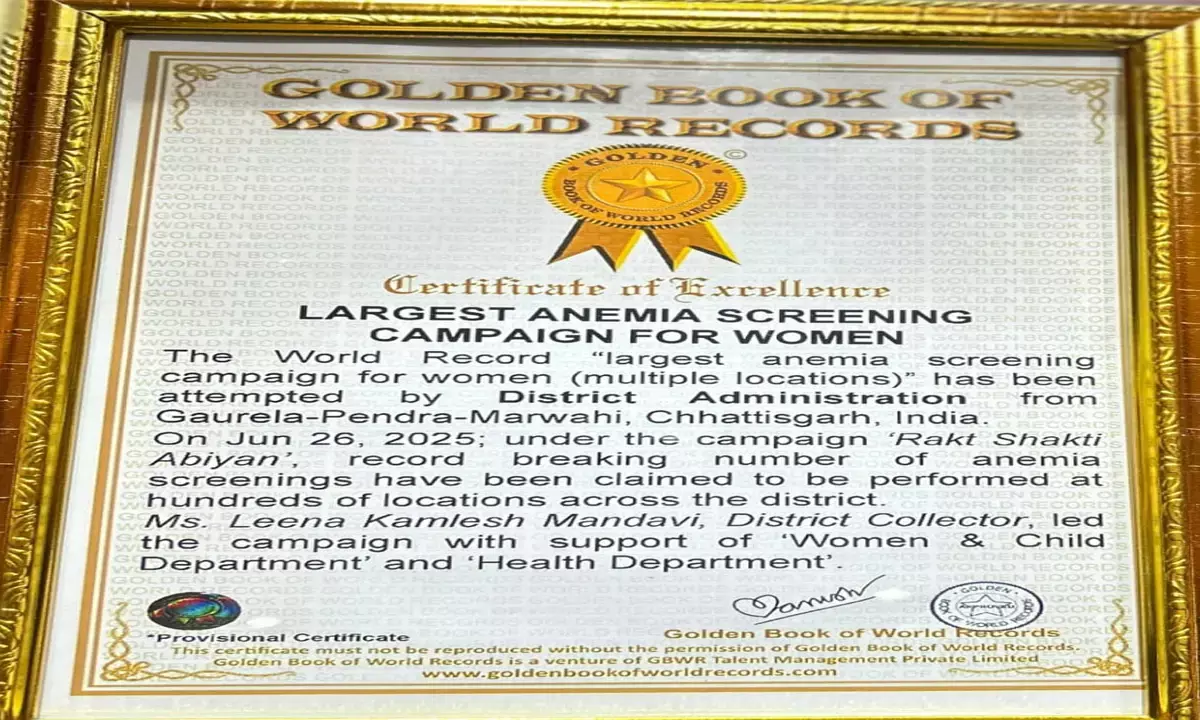 CG News: छत्तीसगढ़ का यह जिला गोल्डन बुक ऑफ वर्ल्ड रिकार्ड में हुआ शामिल, एक ही दिन में 51727 महिलाओं का हुआ एचबी जांच...