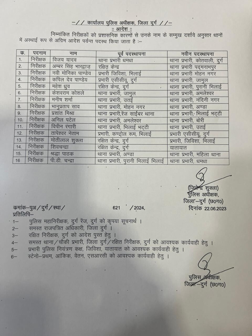 दुर्ग/जीपीएम/रायगढ़। छत्तीसगढ़ के तीन जिले दुर्ग, जीपीएम और रायगढ़ में बड़ी संख्या में इंस्पेक्टर, सब इंस्पेक्टर सहित पुलिस कर्मियों के तबादले किये गये हैं। नीचे देखें लिस्ट...