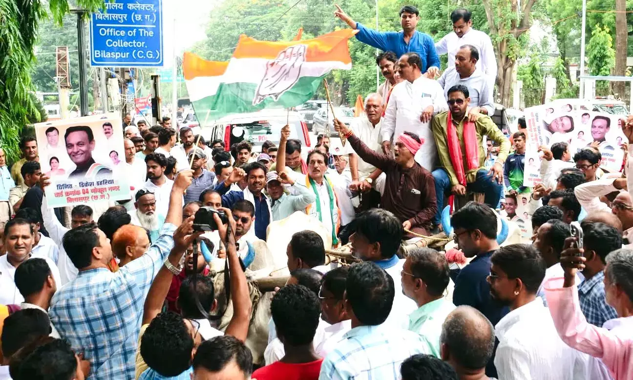 बिलासपुर। अन्नदाता किसानों और शिक्षकों के मुद्दे पर जिला कांग्रेस कमेटी के अध्यक्ष विजय केशरवानी की अगुवाई में जिलेभर से आए कांग्रेसजनों ने जमकर प्रदर्शन किया। आंदोलन के दौरान कांग्रेसजन पूरी तरह छत्तीसगढ़िया अंदाज में रंगे नजर आए। कांग्रेस के नेता बैलगाड़ी व ट्रैक्टर में सवार थे। कांग्रेस भवन से जब रैली निकली तो नजारा देखने लायक था। सामने कांग्रेेसजनों की भारी भीड़ और पीछे बैलगाड़ी व ट्रैक्टर में सवार नेता। हाथों में पार्टी का झंडा लहराते कार्यकर्ता गगनभेदी नारा लगाते कलेक्टोरेट के लिए कूच किया। भीड़ का आलम ये कि एक छोर कलेक्टोरेट तो दूसरा छोर डाकघर के पास था।