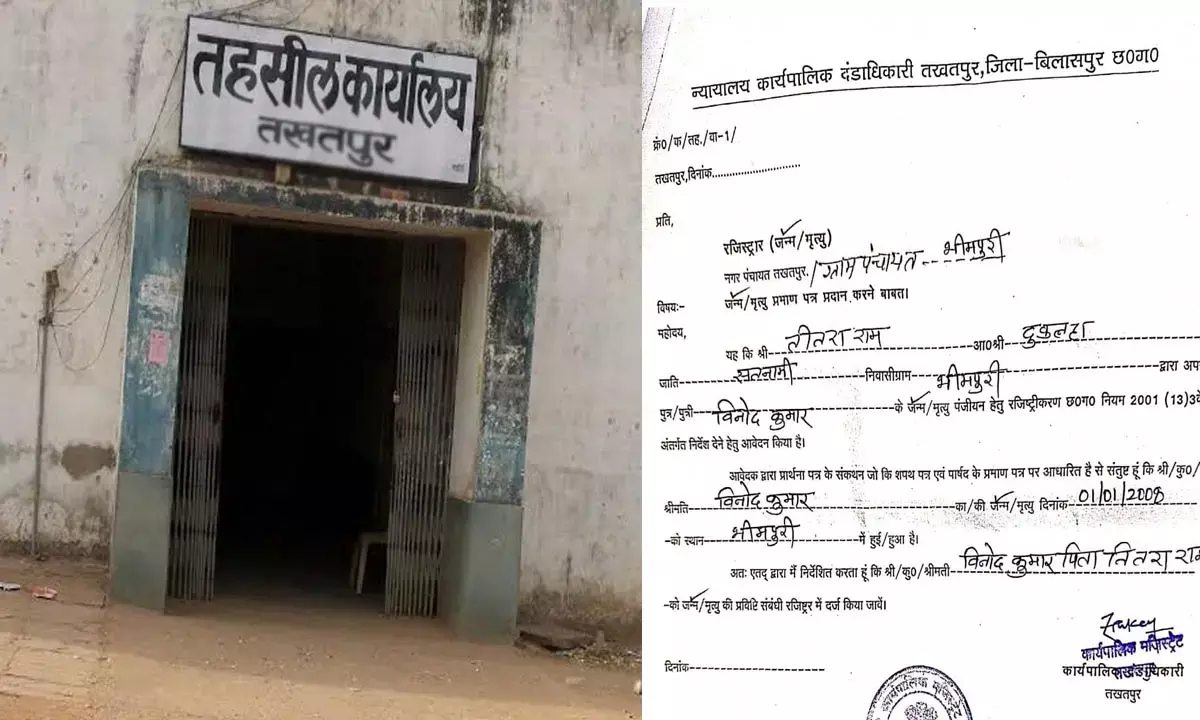 Chhattisgarh News: बिलासपुर। छत्तीसगढ़ के बिलासपुर जिले के तखतपुर में यह सनसनीखेज मामला सामने आया है। क्राइम सीन और क्राइम मूवी से भी कई कदम आगे की सोच रखने वालों ने गजब ही कर दिया। हत्या के एक आरोपी को बचाने के लिए जन्म तिथि में ही हेरफेर कर दिया है। नया बर्थ डे के हिसाब से आधार कार्ड भी बन गया है। यही नहीं नायब तहसीलदार ने फर्जी जन्म तिथि को प्रमाणित भी कर दिया है। बच्चा पैदा होने से पहले से ही स्कूल में एडमिशन भी हो गया। वह भी एक दो नहीं पूरे चार साल पहले। ऐसा कभी हो सकता है। पर ऐसा हुआ है। यह पूरा खेला तखतपुर के नायब तहसीलदार कार्यकाल में ही हुआ है।