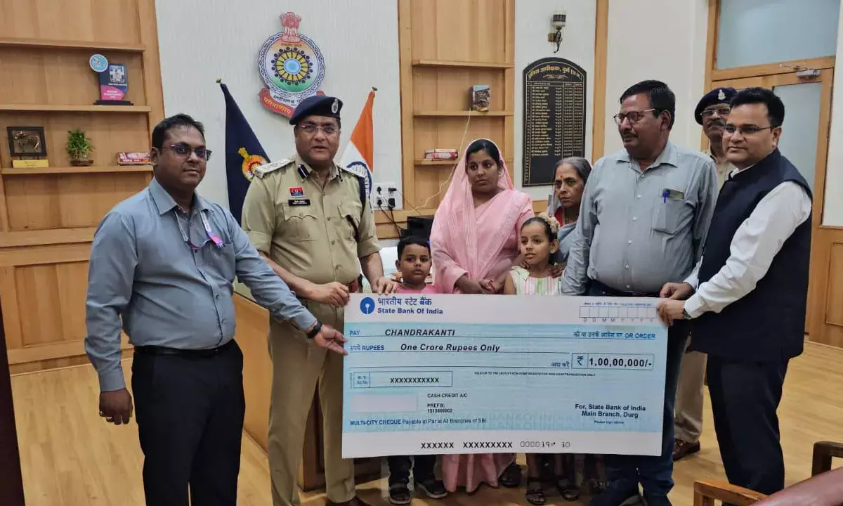 Durg News: दुर्ग। सड़क हादसे में जान गंवाने वाले आरक्षक के नामिनी को दुर्ग एसएसपी और एसबीआई के शाखा प्रबंधक ने 1 करोड़ का चेक सौंपा।