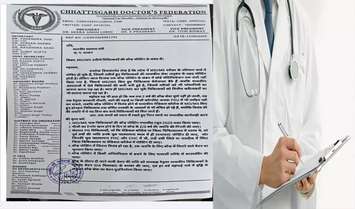 Raipur News: छत्तीसगढ़ के MD/MS उत्तीर्ण चिकित्सकों की बॉन्ड पोस्टिंग में देरी को लेकर आक्रोश, तत्काल कार्रवाई की मांग
