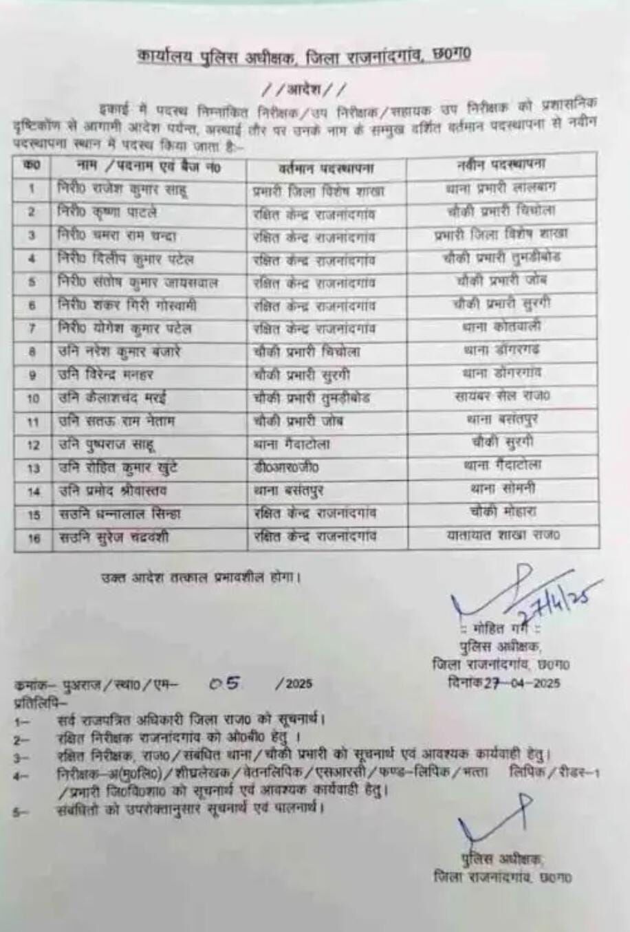 Rajnandgaon News: इंस्पेक्टर, सब इंस्पेक्टर, एएसआई के तबादले, एसपी ने की सूची जारी...