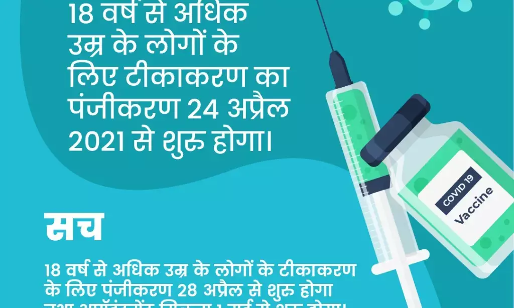कुछ रिपोर्ट्स में बताया जा रहा है कि एक मई से होने वाले टीकाकरण के लिए 18+ लोगों का रजिस्ट्रेशन 24 अप्रैल से शुरू होने वाला है. जबकि सच्चाई कुछ और है. सरकार की ओर से इस बारे में सही जानकारी दी गई है. केंद्र सरकार की ओर से MyGovHindi ट्विटर अकाउंट पर बताया गया है कि 18+ लोगों के वैक्सिनेशन के लिए रजिस्ट्रेशन 24 अप्रैल से नहीं, बल्कि 28 अप्रैल से शुरू होगा.
