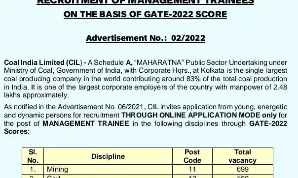 रायपुर 20 जून 2022। कोल इण्डिया लिमिटेड में अधिकारी वर्ग में भर्ती हेतु विज्ञापन जारी । GATE परीक्षा के ज़रिए खनन, सिविल , ई & टी , सिस्टम आदि सँवर्ग में एक हज़ार से अधिक पद । देखें ये पूरा लिस्ट...