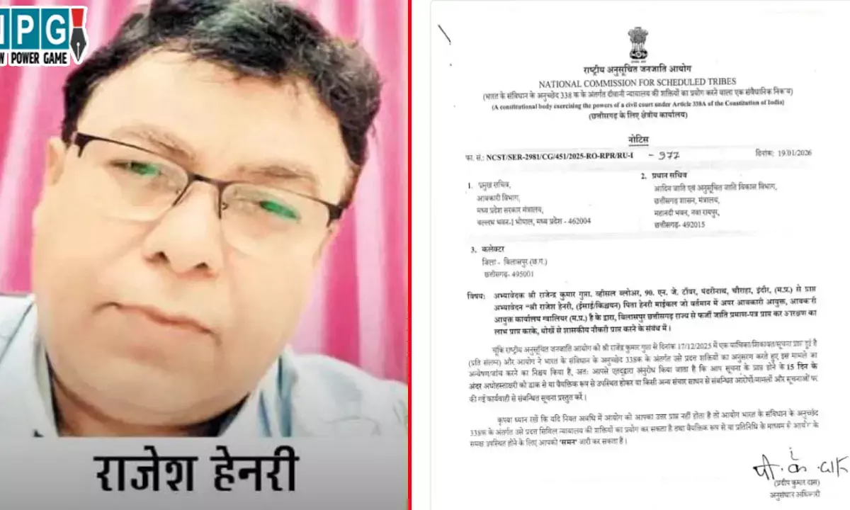 चूंकि राष्ट्रीय अनुसूचित जनजाति आयोग को श्री राजेंद्र कुमार गुना से दिनांक 17/12/2025 में एक याचिका शिकायत सूचना शा हुई है (प्रति नंतर) और आयोग ने भारत के संविधान के अनुच्छेद 338क के अंतर्गत ओ प्रदत्त शक्तियों का अनुसरण करते हुए इस मामले का अन्वेषणांच करने का निश्चय किया है, अतः आपसे एतद्द्वमा अनुरोध किया जाता है कि आप सूचना के प्राप्त होने के 15 दिन के अंदर अधोहस्ताक्षरी को डाक से या वैयक्तिक रूप से उपस्थित होकर या किसी अन्य संचार साधन से संबन्धित आरोपों मामलों और सूचनाओं पर की गई कार्यवाही से संबन्धित सूचना प्रस्तुत करें।
