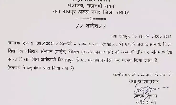DEO नियुक्ति : राज्य सरकार ने बिलासपुर DEO की नियुक्ति का आदेश किया जारी…. अब तक प्रभारी DEO थे बिलासपुर में पदस्थ