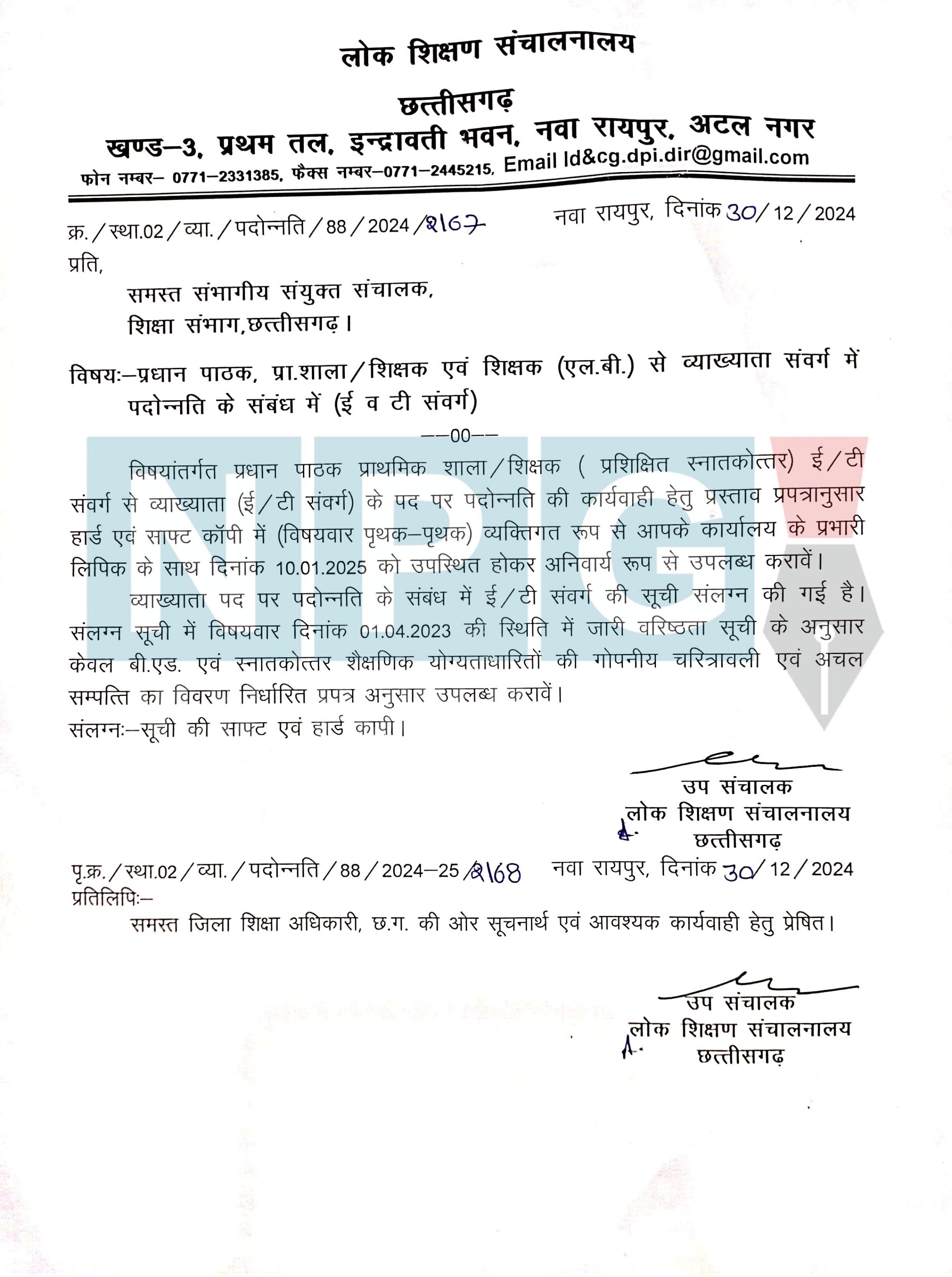 Chhattisgarh Teacher: रायपुर। छत्तीसगढ़ में शिक्षा विभाग में प्रमोशन की प्रक्रिया तेज गति से चल रही है ऐसे में कुछ विषयों को लेकर स्थिति स्पष्ट नहीं थी। लेकिन लोक शिक्षण संचालनालय के पत्र के बाद अब यह स्थिति स्पष्ट होती हुई दिखाई दे रही है।