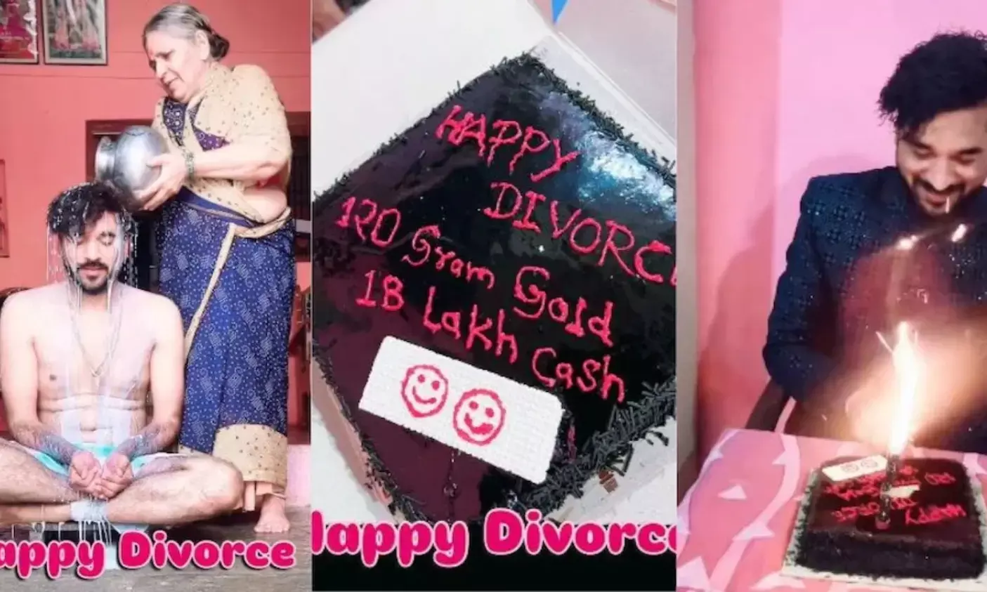 वीडियो में दिखता है कि दूध से नहाने के बाद वह शख्स बिल्कुल दूल्हे की तरह शेरवानी और जूती पहनकर तैयार होता है। फिर वह एक चॉकलेट केक काटता है, जिस पर लिखा है, "Happy Divorced! 120 ग्राम सोना, 18 लाख नकद"। इस जश्न में उसकी मां भी शामिल हैं और बेटे को खुलकर सपोर्ट कर रही हैं।