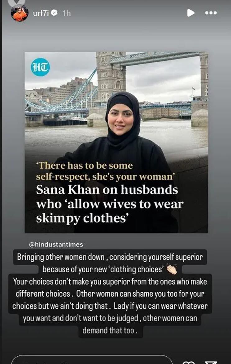 बता दें कि, उर्फी जावेद ने इंस्टाग्राम स्टोरी पर सना के विचारों को लेकर उन्हें आड़े हाथों लिया। सना के कमेंट्स को शेयर करते हुए, लिखा, 'दूसरी महिलाओं को नीचा दिखाना और खुद को सुपीरियर बताना क्योंकि आपके कपड़े पहनने की पसंद बदल गई है। आपकी पसंद आपको उन लोगों से सुपीरियर नहीं बनाती जिनकी पसंद आपसे अलग है।' उर्फी ने आगे सना के लिए लिखा, 'दूसरी महिलाएं भी आपके पहनावे की पसंद के लिए आपको भला-बुरा कह सकती हैं लेकिन वह ऐसा नहीं करती हैं। आप अगर जो पहनना चाहती हैं, उसे पहन सकती हैं और चाहती हैं कि कोई उसके लिए आपको जज न करे तो दूसरी महिलाएं भी यही उम्मीद करती हैं।'