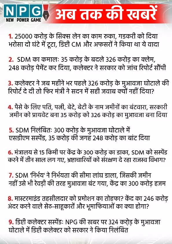 एनपीजी लगातार:- भारतमाला परियोजना में 324 करोड़ के मुआवजा घोटाले का एनपीजी न्यूज ने सबसे पहले भंडाफोड़ किया। एनपीजी ने इससे संबंधित दर्जन भर खबरें लगातार प्रकाशित किया। इसके बाद नेता प्रतिपक्ष चरणदास महंत ने इस पर विधानसभा के बजट सत्र में सवाल भी लगाया। देखिए, एनपीजी की प्रकाशित खबरों का लिंक....