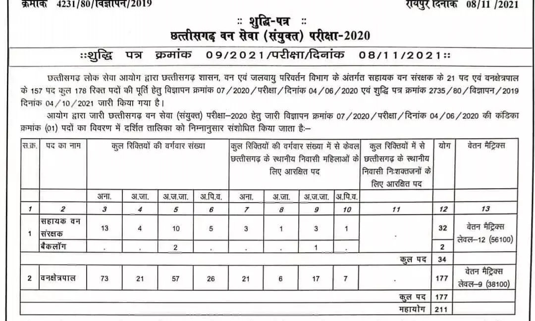 रायपुर, 9 नवंबर 2021। पीएससी द्वारा आयोजित होने वाली वन सेवा परीक्षा के पद बढा दिए गए हैं। 5 दिसम्बर को होने वाली परीक्षा के लिए 178 पद विज्ञापित किये गए थे। जिनमें फारेस्ट एसडीओ व रेंजर के अलग अलग पद पर भर्ती निकाले गए थे। कल पीएससी ने शुद्धि पत्र जारी कर पद बढ़ा दिये है अब सहायक वन सरंक्षक के बैकलॉग समेत कुल 34 पदों पर व रेंजर के 177 पदों पर भर्ती होने वाली हैं। अर्थात अब 178 पदों पर होने वाली भर्ती अब सहायक वन सरंक्षक व रेंजर के कुल 211 पदों के लिए होगी।