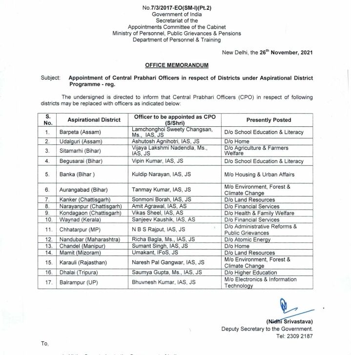 रायपुर,27 नवंबर 2021। केंद्र सरकार ने छत्तीसगढ कैडर के तीन अधिकारियों जो कि केंद्रीय प्रतिनियुक्ति पर हैं उन्हें उनके होम कैडर के उन ज़िलों का केंद्रीय प्रभारी बनाया है जो कि आकांक्षी जिले हैं।