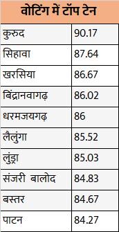 छत्तीसगढ़ की 90 में से एक सीट पर 90 प्रतिशत से ज्यादा वोटिंग हुई है। 37 सीटों पर 80 प्रतिशत या उससे ज्यादा वोटिंग हुई है। वोटिंग के मामले में टॉप टेन सीटों में पहले दो नाम धमतरी जिला की हैं। पहला नंबर कुरुद और दूसरा नंबर सिहावा का है। इस जिले की तीसरी सीट धमतरी में भी 82 प्रतिशत से ज्यादा मतदान हुआ है, लेकिन वह टॉप टेन में नहीं है। टॉप टेन में तीसरे नंबर पर रायगढ़ जिला की खरसियां सीट है। वहां 86.67 प्रतिशत मतदान हुआ है। इसके बाद नंबर गरियाबंद जिला की बिंद्रानवागढ़ सीट का है। वहां 86.02 प्रतिशत वोटिंग हुई है। रायगढ़ जिला की धरमजयगढ़ सीट पर 86 प्रतिशत वोट पड़े हैं। इसी तरह लैलुंगा में 85.52, लुंड्रा में 85.03, संजरी-बालोद में 84.83 और बस्तर सीट पर 84.67 प्रतिशत वोट पड़े हैं। इस सूची में 10वें नंबर पर हाई प्रोफाइल और हाई वोल्टेज पाटन सीट है। वहां 84.27 प्रतिशत मतदान हुआ है।