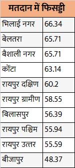 सबसे कम वोटिंग वाली 10 सीटों में बस्तर संभाग की 2 को छोड़कर बाकी सभी हार्डकोर शहरी सीटें हैं। इस सूची में पहले नंबर पर बीजापुर है। वहां 48.37 प्रतिशत मतदान हुआ है। यह 90 सीटों में सबसे कम वोटिंग है। रायपुर की उत्तर सीट पर 55.59 प्रतिशत वोट पड़ा है। इसका नंबर नीचे से दूसरा है। रायपुर पश्चिम में 55.94 और बिलासपुर में 56.39 प्रतिशत वोट पड़े हैं।नीचे से पांचवें नंबर पर 58.55 वोट के साथ रायपुर ग्रामीण सीट है। इससे ऊपर रायपुर दक्षिण सीट है जहां 60 प्रतिशत मतदान हुआ है। कोंटा में 63.14, वैशाली नगर और बेलतरा में 65.71 और भिलाई नगर में 66.34 प्रतिशत वोट पड़े हैं।