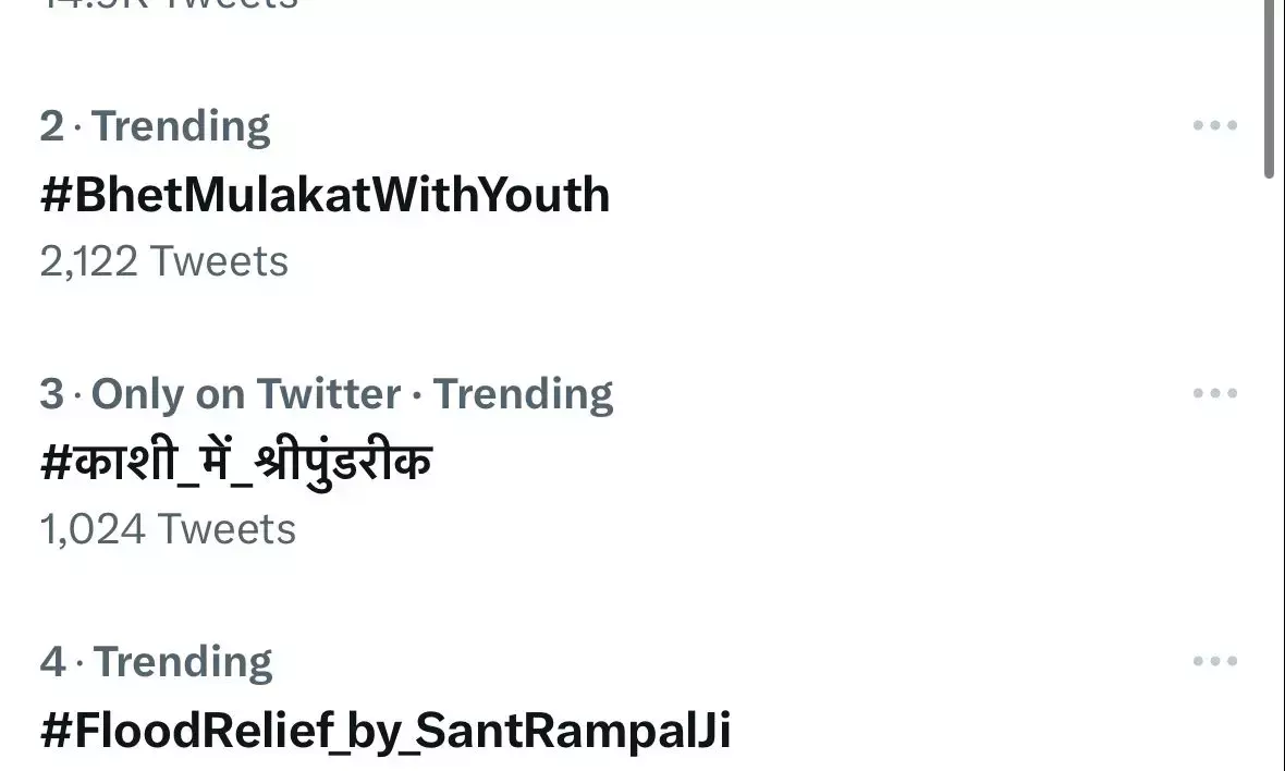 ट्विटर पर इस वक्त जो टॉप टेन ट्रेंड है उनमें #BhentMulakatWithYouth चौथे नंबर पर है। देश में ट्रेंड में पहले नंबर पर #ChandrashekharAzad चल रहा है। दूसरे नंबर पर #काशी_में_श्रीपुंडरीक और तीसरे नंबर पर #DeservesAnArrow है। चौथे नंबर पर #BhetMulakatWithYouth और पांचवें नंबर पर क्रिकेट #IndvPakonFanCode चल रहा है।