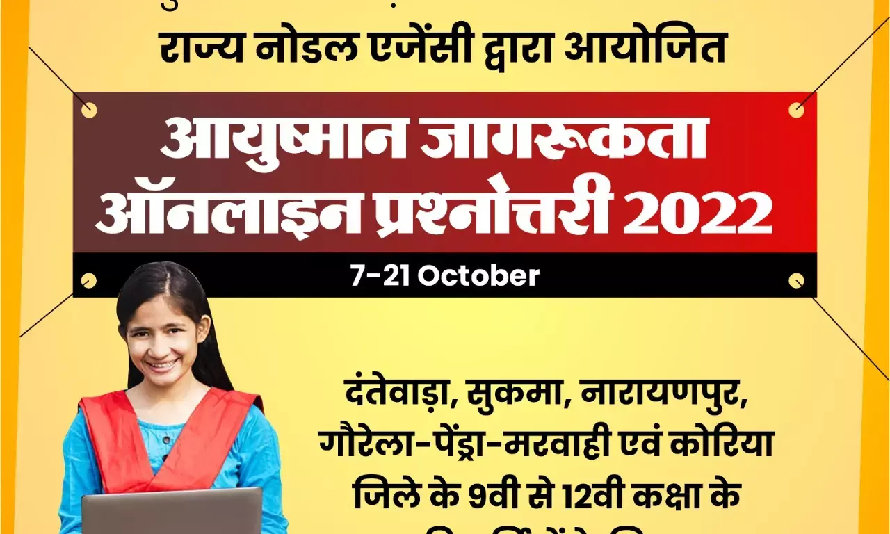 राष्ट्रीय स्वास्थ्य प्राधिकरण के निर्देशानुसार 23 सितम्बर से 07 अक्टूबर तक आयुष्मान पखवाड़े का आयोजन किया गया, जिसमें हेल्थ कैम्प, सायकल रैली, योजना की जानकारी का पाॅम्प्लेट घर-घर तक पहुंचा कर आयुष्मान भारत प्रधानमंत्री जन आरोग्य योजना डाॅ.खूबचंद बघेल स्वास्थ्य सहायता योजना एवं मुख्यमंत्री विशेष स्वास्थ्य सहायता योजना का प्रचार-प्रसार किया गया। 07 अक्टूबर को समापन अवसर पर राज्य के अंतिम छोर के जिलों में स्कूली छात्र-छात्राओं के माध्यम से आम जनमानस तक योजना की जानकारी पहुंचाने के लिये आयुष्मान जागरूकता ऑनलाइन प्रश्नोत्तरी 2022 का आयोजन किया जा रहा है। प्रश्नोत्तरी में योजना से संबंधित सवाल छात्रों से किये जायेंगे, जिसका जवाब ऑनलाइन सही देने पर वेबपोर्टल के माध्यम से ऑनलाइन ही तुरंत छात्रों को सहभागिता प्रमाण पत्र उपलब्ध करा दिया जायेगा। जिसकी शुरूआत आज 07 अक्टूबर से कर दी गई है।