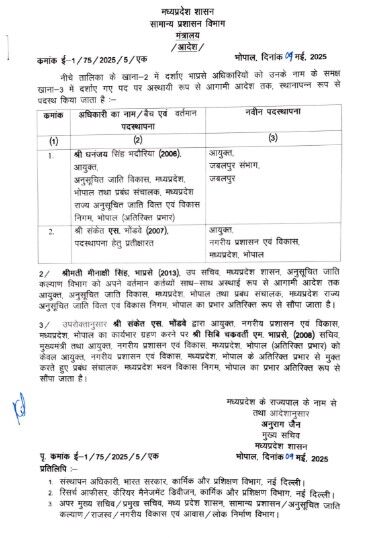 सामान्य प्रशासन विभाग में तबादले और नियुक्ति को लेकर आदेश जारी किया है. जारी आदेश के अनुसार, आईएएस संकेत एस भोंडवे(IAS Sanket S Bhondve) और आईएएस धनंजय सिंह भदौरिया(IAS Dhananjay Singh Bhadoria) का ट्रांसफर हुआ है. मुख्यमंत्री के सचिव आईएएस सिबी चक्रवर्ती एम(IAS Sibi Chakravarti M) के पास से नगरीय विकास और आवास विभाग का आयुक्त की जिम्मेदारी वापस ले ली गयी है. उनके पास भवन विकास निगम के एमडी का अतिरिक्त प्रभार रहेगा.