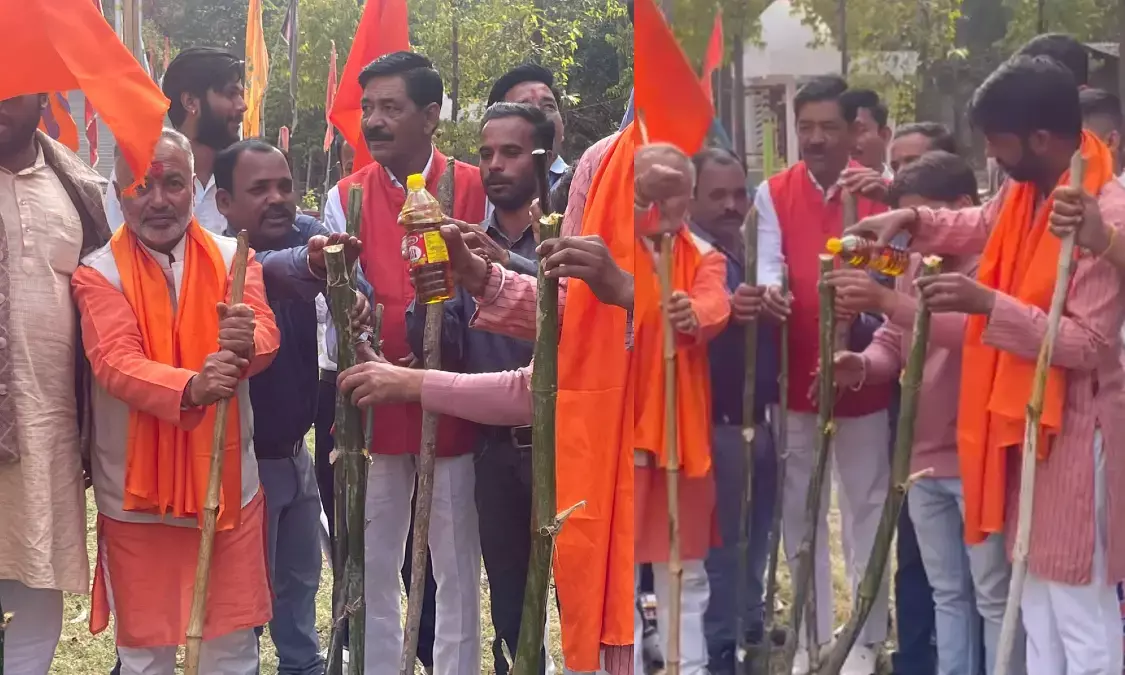 MP News : वेलेनटाइन डे के पहले ही मध्य प्रदेश का माहौल गरम है। शिवसेना कार्यकर्ता दिवस को लेकर विरोध में है। इसी कड़ी में मध्य प्रदेश के सागर में वैलेंटाइन डे से ठीक पहले शिवसेना कार्यकर्ताओं ने सिविल लाइन स्थित पहलवान बाबा मंदिर में इकट्ठा होकर वैदिक मंत्रोच्चारण के बीच लट्ठों की विधिवत पूजा की. पंडित-पुरोहित की मौजूदगी में लाठी पूजन किया गया. इस दौरान खास बात यह रही कि इन लट्ठों पर चमेली और सरसों का तेल चढ़ाया गया. कार्यकर्ताओं ने इसे संस्कृति रक्षा का प्रतीक बताया.