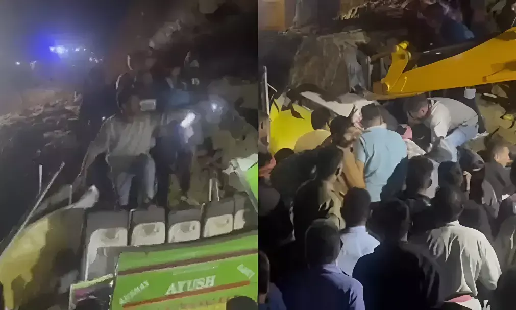 बस पर पहाड़ी से अचानक भारी मलबा गिरा जिससे वह पूरी तरह मलबे में दब गई। देखते ही देखते इस दर्दनाक हादसे में 18 लोगों की मौत हो गई है, जबकि दो बच्चियों और एक बच्चे को जिंदा निकाला गया है। इनमें से एक बच्ची की मां की मौत हो चुकी है।