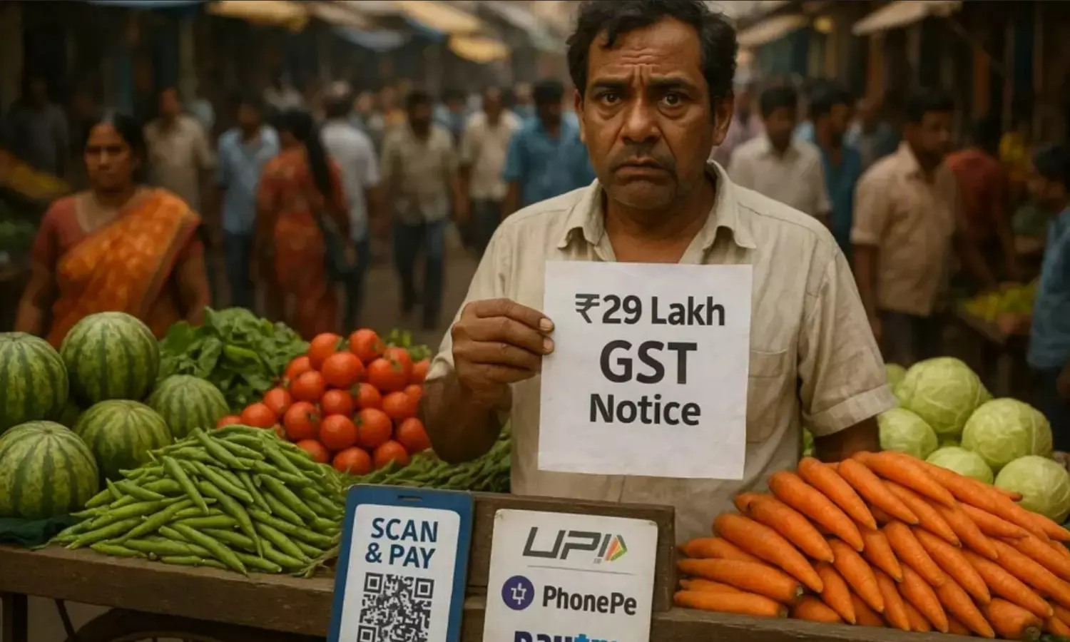 GST Notice Sabji Wala: कर्नाटक में एक सब्जी बेचने वाले को 29 लाख रुपये का जीएसटी नोटिस मिला है, वजह जान कर आप माथा पकड़ लेंगे, सब्जी विक्रेता ने पिछले चार साल में UPI से 1.63 करोड़ रुपये का लेनदेन किया।