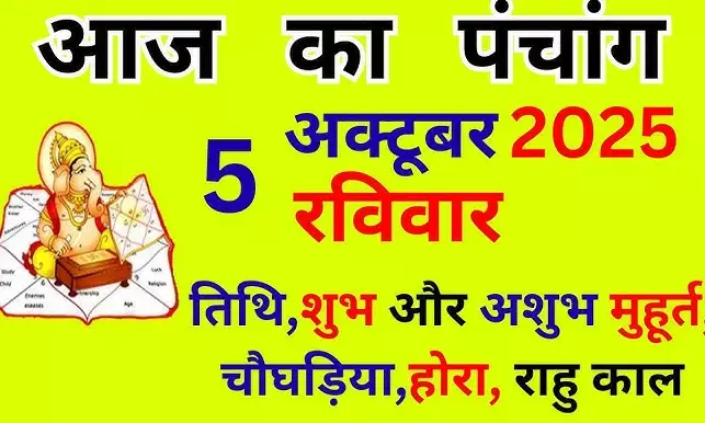 5 October 2025 ka Panchang : 5 अक्तूबर 2025 को आश्विन मास शुक्ल पक्ष त्रयोदशी तिथि दिन रविवार है, त्रयोदशी तिथि दोपहर 3.03 तक रहेगी | भगवान् श्री शिव शंकर के आराधना का दिन है | रवि योग होने से शुभ स्वास्थ्य और धन धान्य की प्राप्ति होगी | आज कुमार पूर्णिमा होने से संतान प्राप्ति का योग है | श्रीगणेश का पूजन कर अभिषेक करें.
