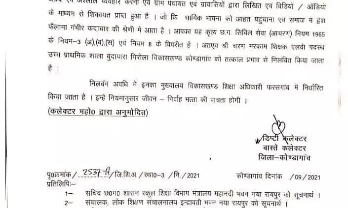 कोण्डागांव 2 सितंबर 2021। धार्मिक भावनाओं को आहत करने वाले एक शिक्षक को कलेक्टर पुष्पेंद्र कुमार मीणा ने सस्पेंड कर दिया है। निलंबित शिक्षक का नाम एलबी शिक्षक चरण मरकाम है, जो शासकीय उच्च प्राथमिक विद्यालय बूंदापारा में पदस्थ है।