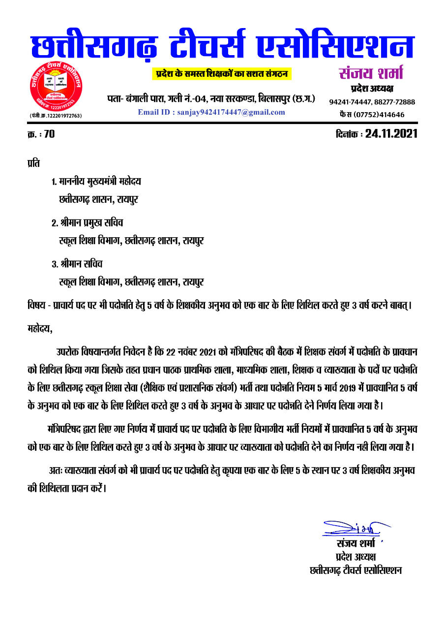 रायपुर 24 नवम्बर 2021। छत्तीसगढ़ टीचर्स एसोसिएशन के प्रदेश अध्यक्ष संजय शर्मा ने मुख्यमंत्री महोदय, प्रमुख सचिव स्कूल शिक्षा विभाग, सचिव स्कूल शिक्षा विभाग को पत्र लिखकर प्राचार्य पद पर भी पदोन्नति हेतु 5 वर्ष के शिक्षकीय अनुभव को एक बार के लिए शिथिल करते हुए 3 वर्ष करने की मांग की है।